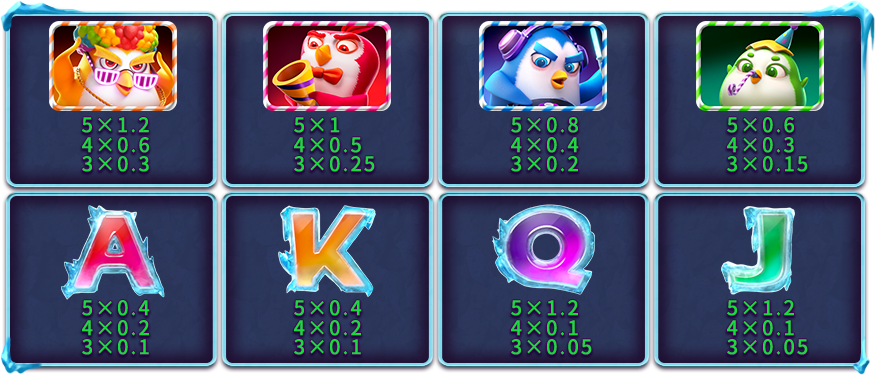 All wins begin with leftmost reel, and pay left to right with 3 or more identical symbols appearing on adjacent reels.
