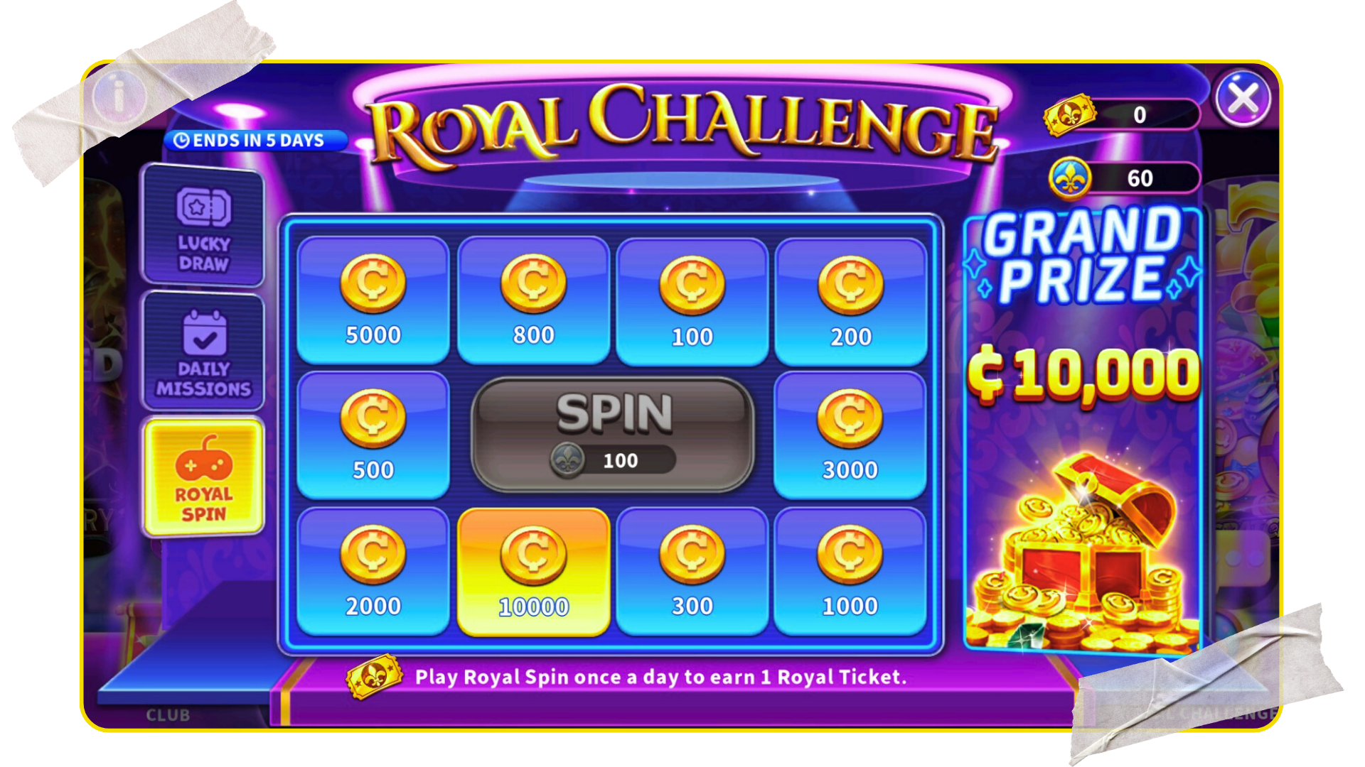 Royal Spin Prize Pool: 100 – 10,000 Coins